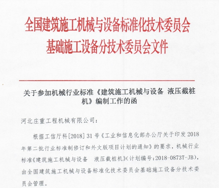 作为液压截桩机领域的领军企业,河北庄重工程机械有限公司始终秉持“创新驱动,标准先行”的理念,深度参与了该标准的编制工作。公司派出技术专家全程参与技术调研、参数验证及标准研讨,为标准的科学性、先进性和实用性提供了坚实的技术支撑。此次参编充分展现了公司在液压截桩机领域的专业实力与行业责任感。